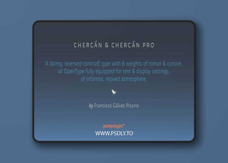 It can be a great choice for setting texts that require a slightly informal atmosphere without loosing authority. Chercán is the Chilean name for the melodious little bird ‘Troglodytes aedon’ usually found all across the Americas. Available in Std and Pro versions with all the usual OT features, Chercán addresses all modern needs of the demanding typographer..