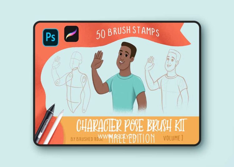 https://creativemarket.com/Brushedrosedigital/5944576-Character-Pose-Brush-Kit-Male