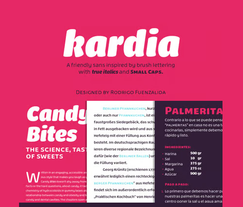 Kardia is a versatile type family that lets you compose a wide range of texts, from extensive reading materials to striking, eye-catching headlines and titles. Features include ample proportions that have been revised to maintain similar line performance across all its weights. It also has an elevated x-height which facilitates reading in small bodies, in addition to help building solid headlines. Inspired by brush lettering, it takes many features from calligraphic strokes and the foundational style, adapted to a contemporary typographic language. It has 4 weights, all of them including their corresponding italics, small caps and character set that supports Central, Western and South Eastern European, Afrikaans and many more.