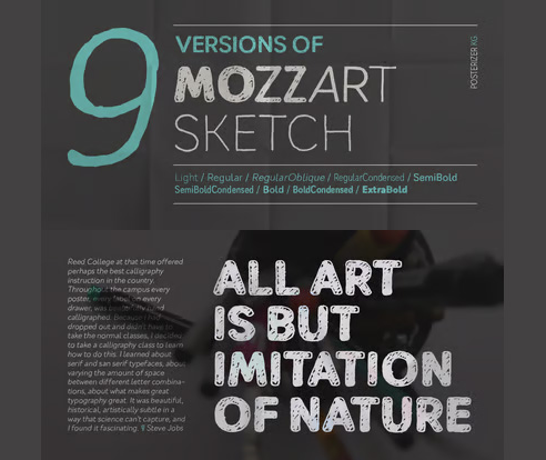 Mozzart Sketch is a decorative version of Mozzart Sans, slightly rounded, Neo-Grotesque corporate font, created for MOZZART D.O.O. company from Belgrade, Serbia. Mozzart Sketch is a decorative hand-sketched font for headlines and short texts, and also very readable in small weights. All glyphs were carefully hand drawn, with marker as a tool, then traced and digitized. The family contains: 5 Weights, 3 Condensed and 1 Oblique versions of the font, complementing each other perfectly. All versions contains completely MacOS Roman and MacOS Cyrillic code pages, tabular figures, small caps… perfect for profesional designers and very useful for artistic things, catalogues, music… and many other sensual and beautiful things. Mozzart Sketch is for everybody, just like Mozart’s music! Enjoy!