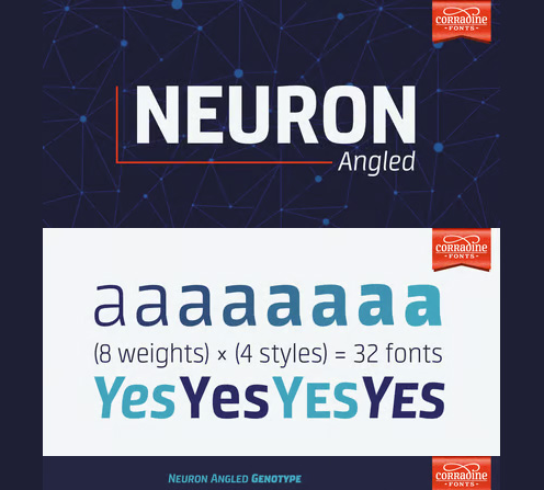 Neuron Angled is based in the idea of Neuron, the original font designed in 2012 by Corradine Fonts’ team, keeping from its predecessor the proportions and slight narrowness. In this version the rounded edges are replaced by sharp contours and flat endings. A broader typographic system is proposed in Neuron Angled to obtain a versatile and modern typeface without missing its original distinctive style. The neutral aspect of the family allows its application in a wide range of projects specially in those related with branding, signage and editorial design. The Neuron Angled family consists of four styles with eight weights each one, for a total of thirty two fonts. The different fonts of the family are not just complementary to each other, but can be used to complement the original version of Neuron. Its wide character map provides coverage for Western European, Eastern European and Cyrillic scripts.