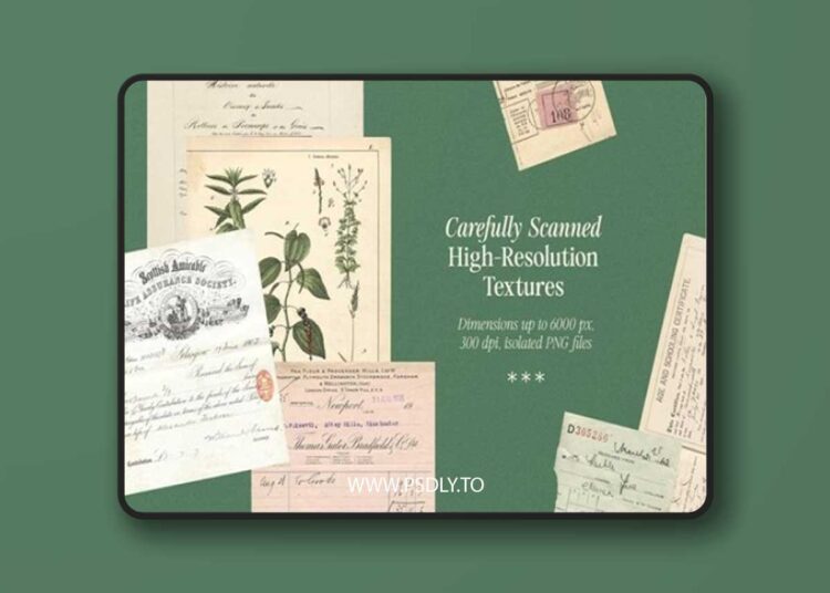 - This pack includes 66 carefully curated vintage paper textures , perfect for graphic designers and creatives who want to add an authentic touch to their work. Inside, you’ll find a variety of scanned elements like antique invoices and receipts, documents, handwritten notes, old book pages, newspapers, postcards, envelopes, letters, tickets, and more.