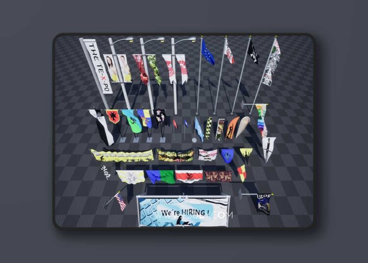Banners and Flags is a collection of banners and flags that react realistically to wind (using Unreal’s Wind Directional Source). They come in a variety of shapes and sizes and are easy to customize. The flags and banners can be used in either modern or medieval/fantasy settings and there should be something for most occasions. The package comes with a banner mast, like the ones you might see in front of a convention hall, three light poles with double banners, four flag banners, like the ones you would see at the beach, four standard flagpoles (the flags themselves differ),