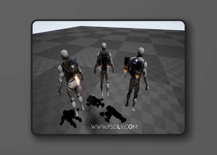 This pack contains all of the textures and materials needed for them to look good including mask and textures set up to allow for some customization of how the jet packs will look. It has all of the animations needed for your character (using default unreal skeleton) to fly around with the packs on their back. Four of the jet packs also have their own sets of animations for controlling their visuals based on how you are flying with them.