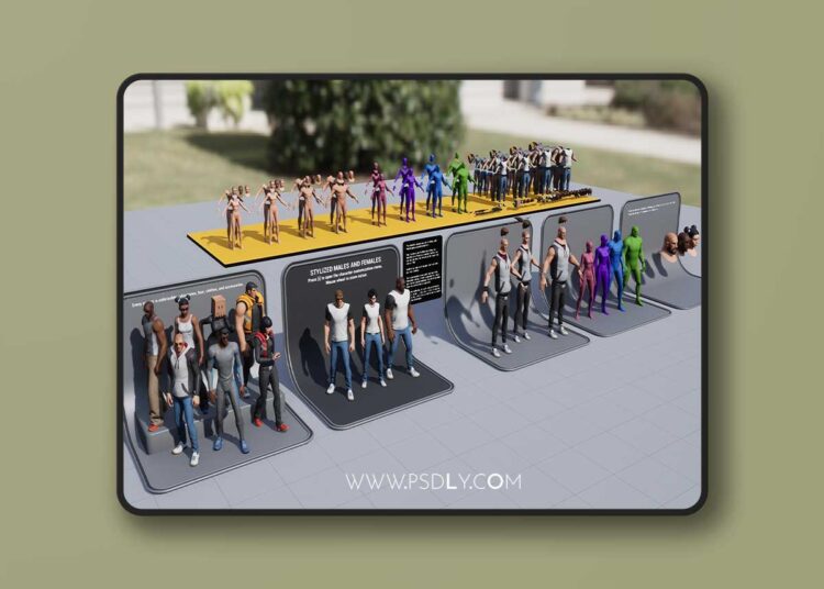 This bundle of stylized characters includes modular bodies, ethnic heads (White/Black/Asian), clothing pieces, hair styles, accessories. Built on the Epic skeleton (UE4 and UE5).