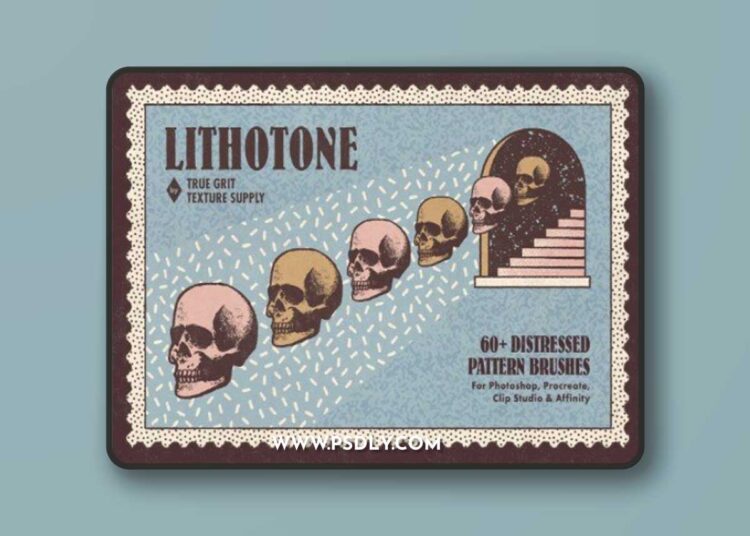 Featuring over 260 Brush Presets and 60 distressed pattern textures, our Lithotone Brush set will have you making distressed pattern magic faster than you say “I am the shroom, the shroom is me”! From classics such as noise, donut sprinkles, sneaker crackle and geometrics to organic gems like brushstrokes, splatter and fabrics, the Lithotone Distressed Pattern Brush Set features a diverse selection of original pro-quality patterns that repeat endlessly for seamless application onto any artwork.
