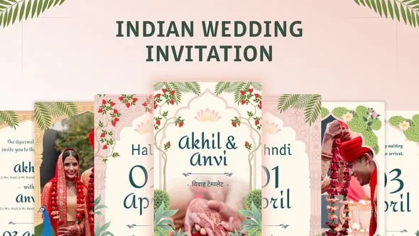 Indian Wedding Invitation template, stunningly designed to capture the essence of an Indian wedding. Perfect for weddings, Mehndi, Haldi, and reception events, this animated video invite is available in After Effects .AE and .MOGRT formats.